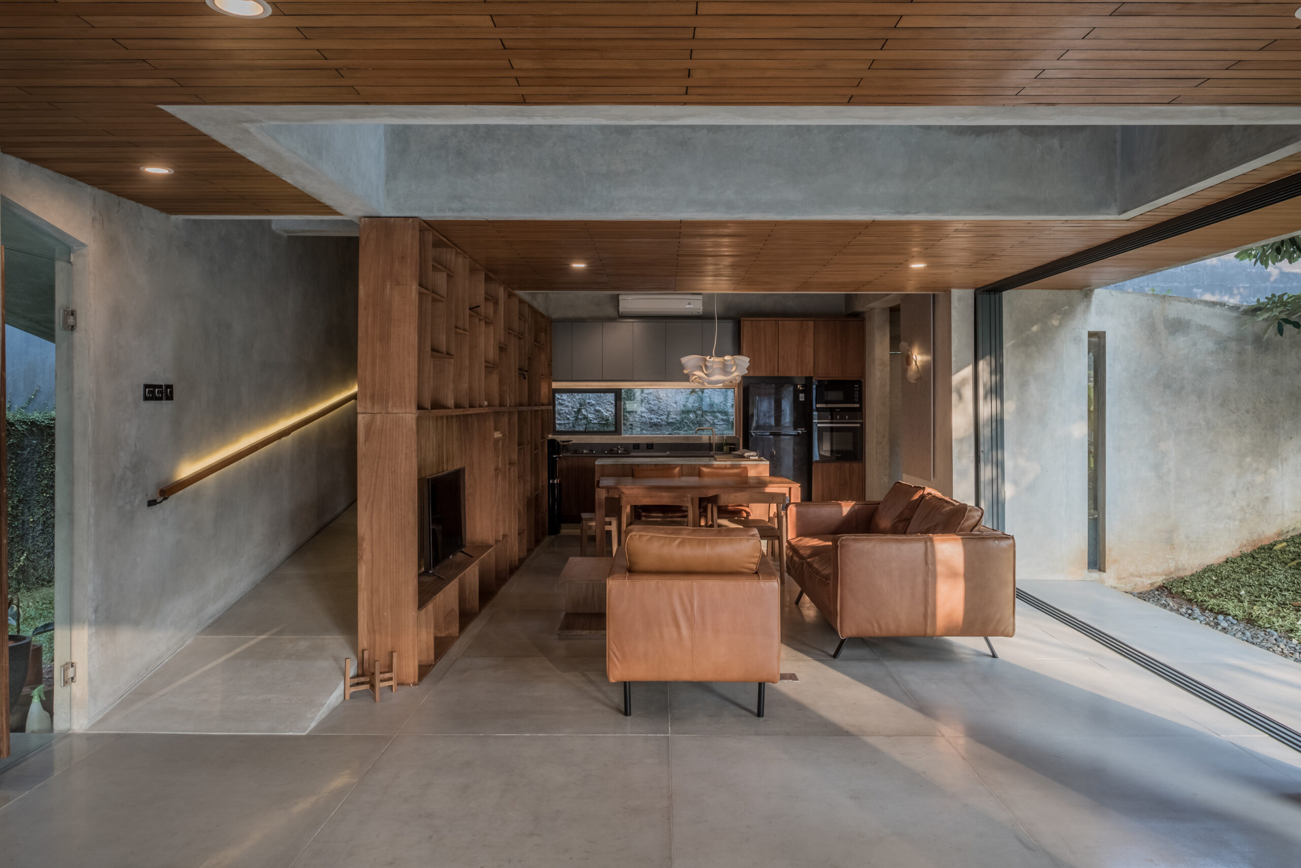 The circulation space utilizes natural ventilation and sunlight to create a tropical home concept. Maximize openings in every space with large windows for rooms facing the garden. And horizontal rips for circulation spaces, both on the walls and ceiling in the form of skylights. Each room has a view towards the garden with wide openings. The green space is designed linearly from front to back, continuously from the ground floor to the roof of the service rooms.